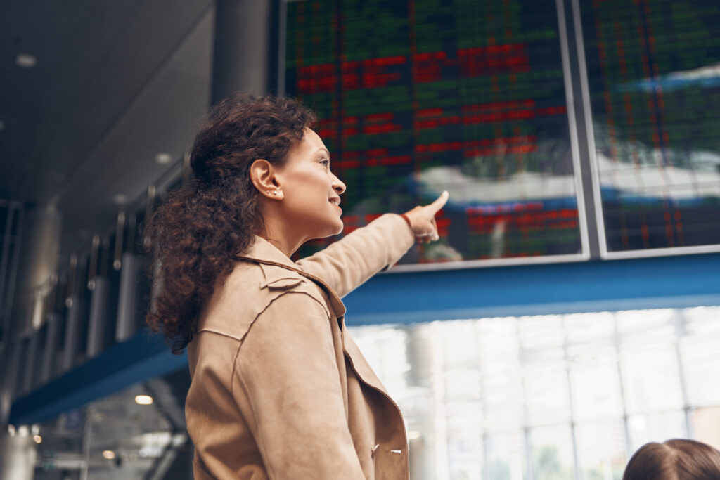 Beautiful mature woman pointing at the flight information board while standing in airport terminal